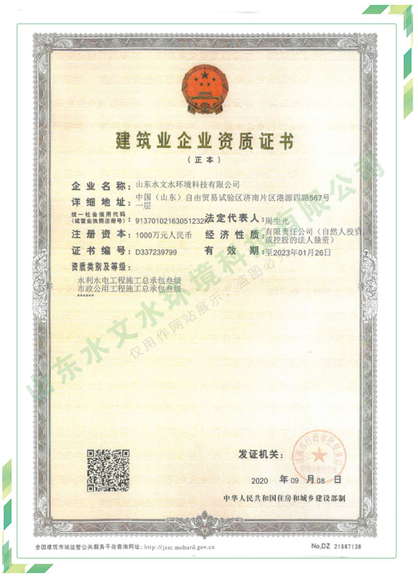 公司擁有水利工程設(shè)計(jì)、水土保持、水文水資源調(diào)查評(píng)價(jià)、水資源論證、建設(shè)項(xiàng)目環(huán)境影響評(píng)價(jià)、市政公用工程施工總承包、水利水電工程施工總承包、電子與智能化工程專業(yè)承包等資質(zhì),2017年通過質(zhì)量管理體系、環(huán)境管理體系、職業(yè)健康安全管理體系認(rèn)證;2020年被評(píng)為國(guó)家級(jí)高新技術(shù)企業(yè),同年被中國(guó)水利企業(yè)協(xié)會(huì)推薦為第一批“合同節(jié)水服務(wù)企業(yè)”;2021年被山東省、濟(jì)南市評(píng)為 “專精特新”中小企業(yè)。業(yè)務(wù)范圍涉及水利工程設(shè)計(jì);節(jié)水設(shè)計(jì)、改造、水平衡測(cè)試;山洪災(zāi)害調(diào)查;城市水資源調(diào)查評(píng)價(jià);建設(shè)項(xiàng)目水土保持方案編制、監(jiān)測(cè)、驗(yàn)收、水土保持規(guī)劃;水安全保障規(guī)劃、建設(shè)項(xiàng)目水資源論證、規(guī)劃水資源論證;建設(shè)項(xiàng)目環(huán)境影響評(píng)價(jià);入河排污口論證;防洪影響評(píng)價(jià);市政公用工程施工、水利水電工程施工、電子與智能化工程施工等。